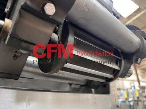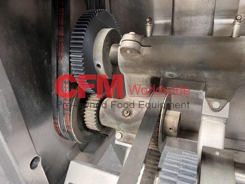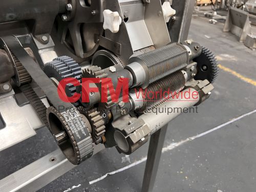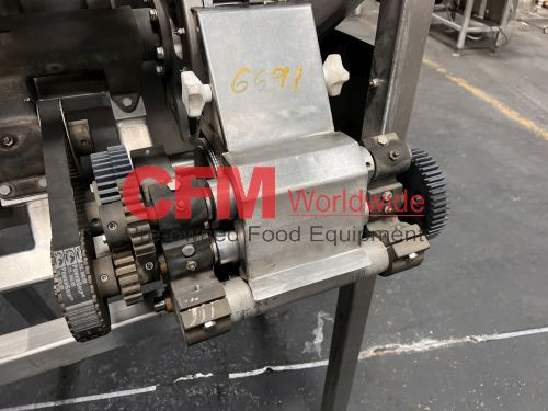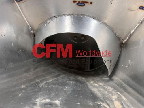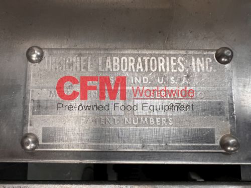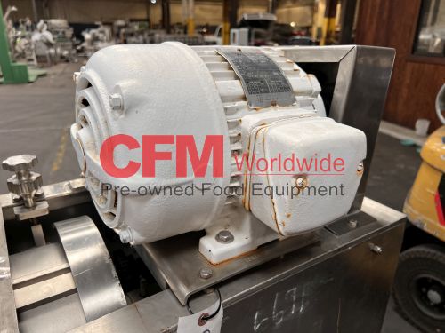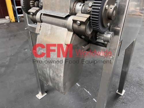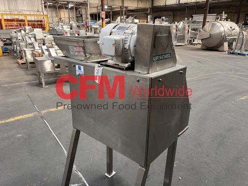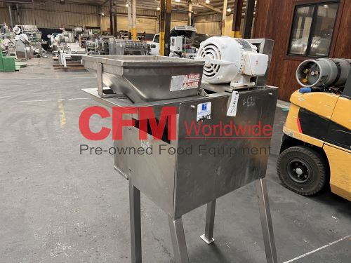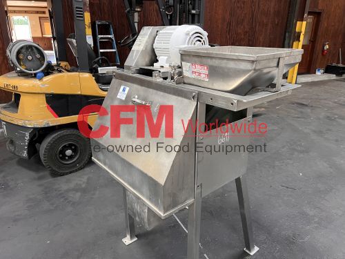 Urschel model RA-A dicer, set up for a 1/4" dice, hopper infeed, with front guard, discharge chute, chip guard and drive guard, 3hp 230/460/3/60 belt drive, on casters, serial number 479, all stainless steel contact and frame construction, as is, good condition.