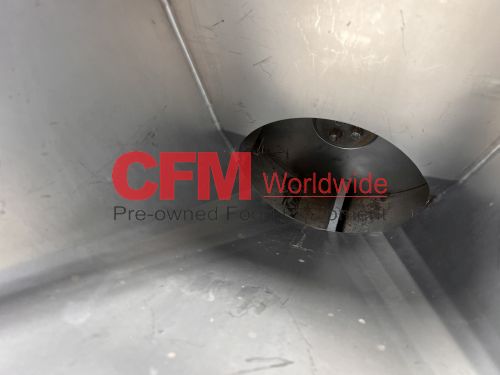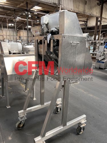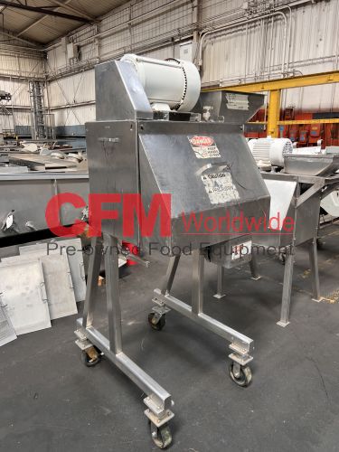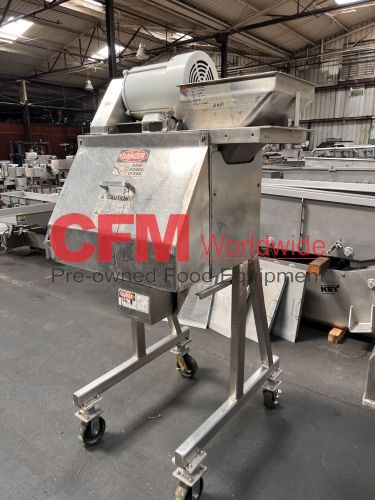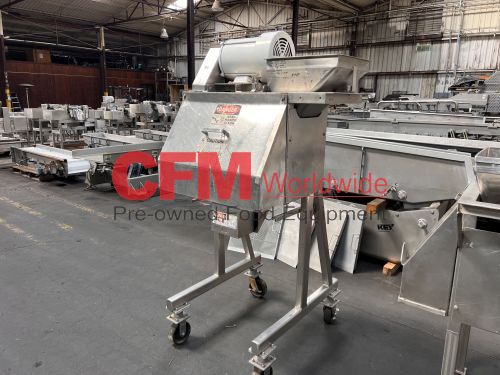 Urschel model RA dicer, set up for a 1/4" dice, hopper infeed, with front guard, discharge chute, chip guard and drive guard, 3hp 230/460/3/60 belt drive, all stainless steel contact and frame construction, as is, good condition.