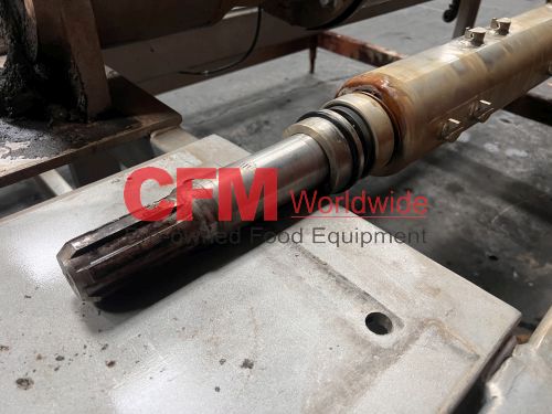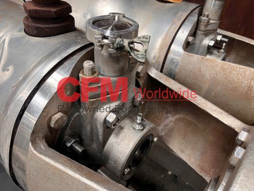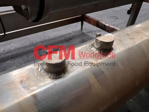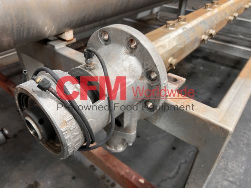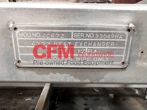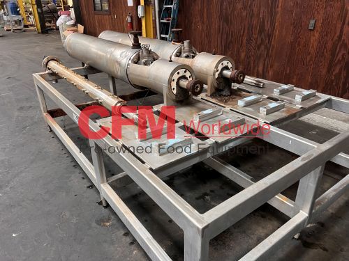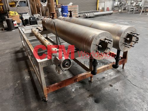 Votator (Cherry-Burrell) dual 6" x 72" swept surface heat exchangers, each with 9 square feet of surface area, 2" Tri-Clamp fittings, no drives, mounted on a factory built stainless steel frame for four units, model 4C672, serial number 93049HA, barrels have their own serial numbers, A5374 and A5377, 1993, fair condition, as is.