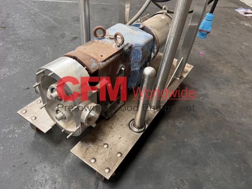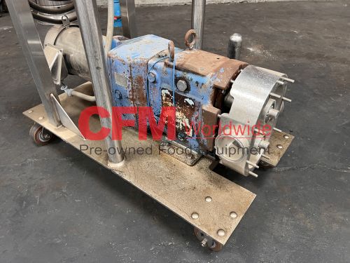 Waukesha model 130 positive displacement pump, 3" Tri-Clamp fittings, 5hp stainless steel direct gearhead drive with Waukesha gearbox, stainless steel mobile cart with control panel, missing face plate and rotors, serial number 412511-06, as is, fair condition.