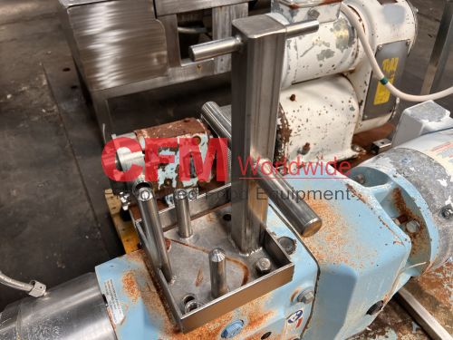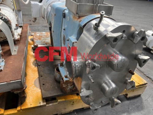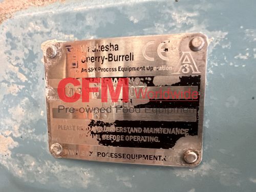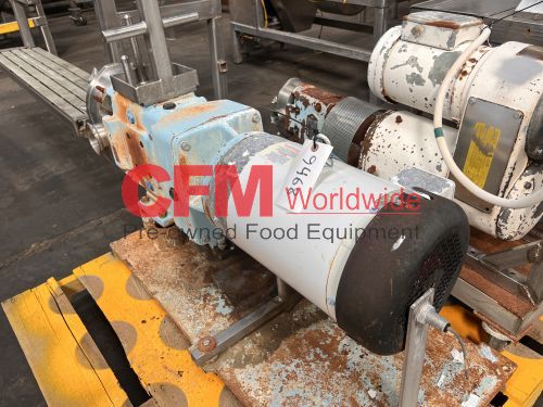 Waukesha model 133 positive displacement pump, stainless steel contact, 3" aseptic fittings, 10hp gearhead  direct drive with a Waukesha gearbox, 1770 rpm, 230/460/3/60, serial number 433878-07, as is, good condition.