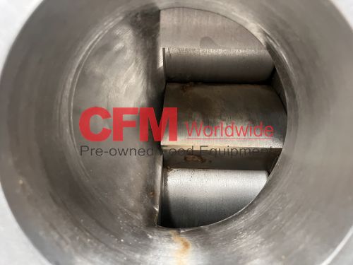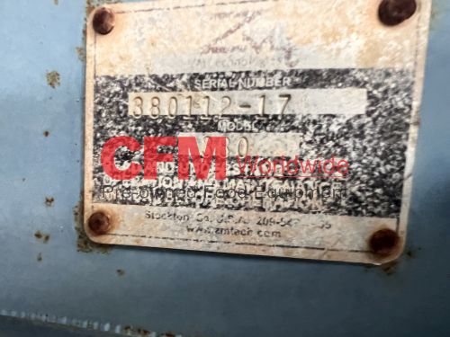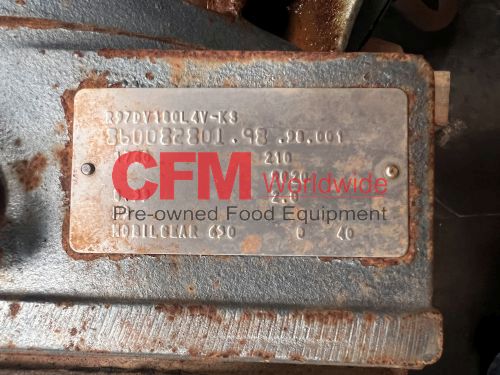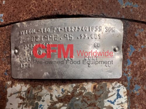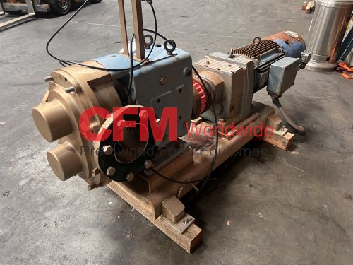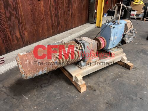 Waukesha model 380 positive displacement pump, 6" bolt flange ports, mounted vertically on a mild steel frame and driven by a 40hp 1570rpm direct drive with gearhead transmission, 230/460/3/60, serial number 380112-17, stainless steel contact parts, need to confirm the motor HP, fair to good condition, as is.