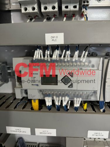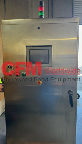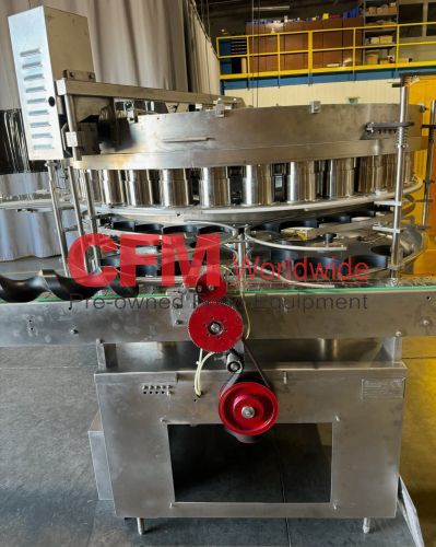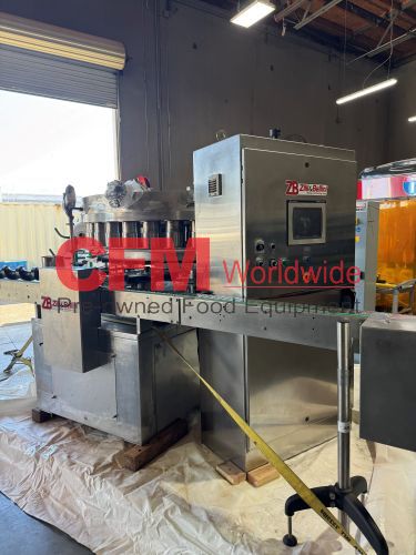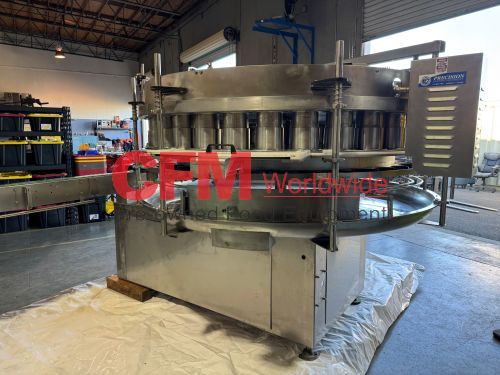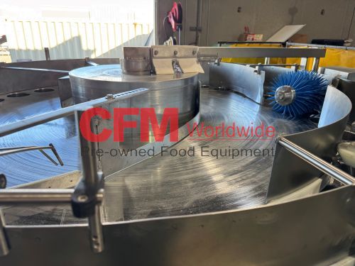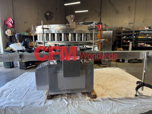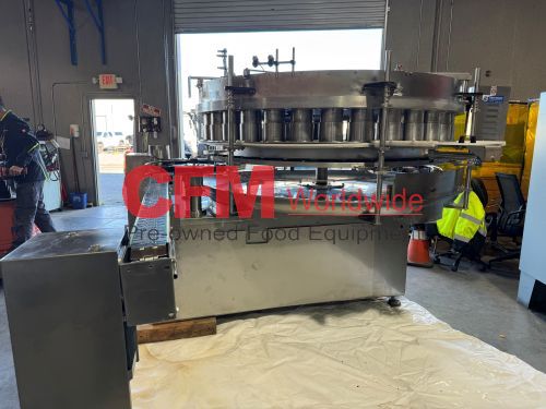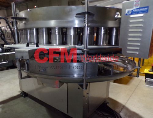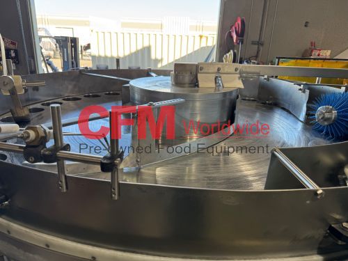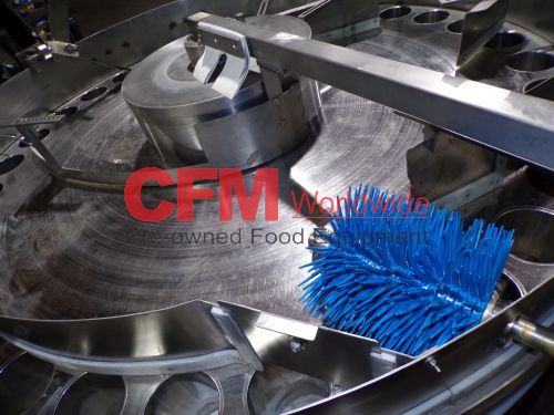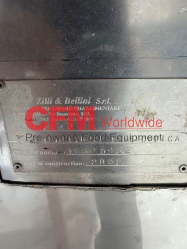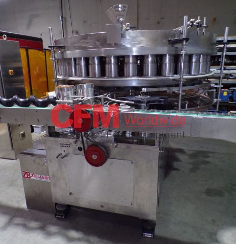 Zilli-Bellini model TC32 thirty two station rotary volumetric pocket filler, set up for 603x700 cans, left-to-right feed, through conveyor to a worm-star infeed, clockwise bowl rotation, air actuated no-can-no-fill, with a rotary brush for pock topping, all stainless steel contact and frame construction, with control panel including an Allen-Bradley MicroLogix 1400 plc, , serial number TC320902, 2002, rebuilt, as is.